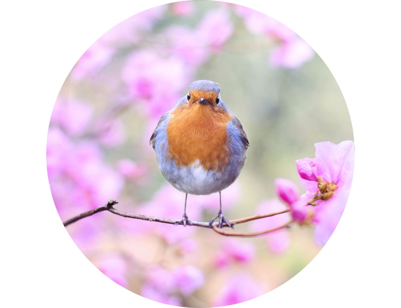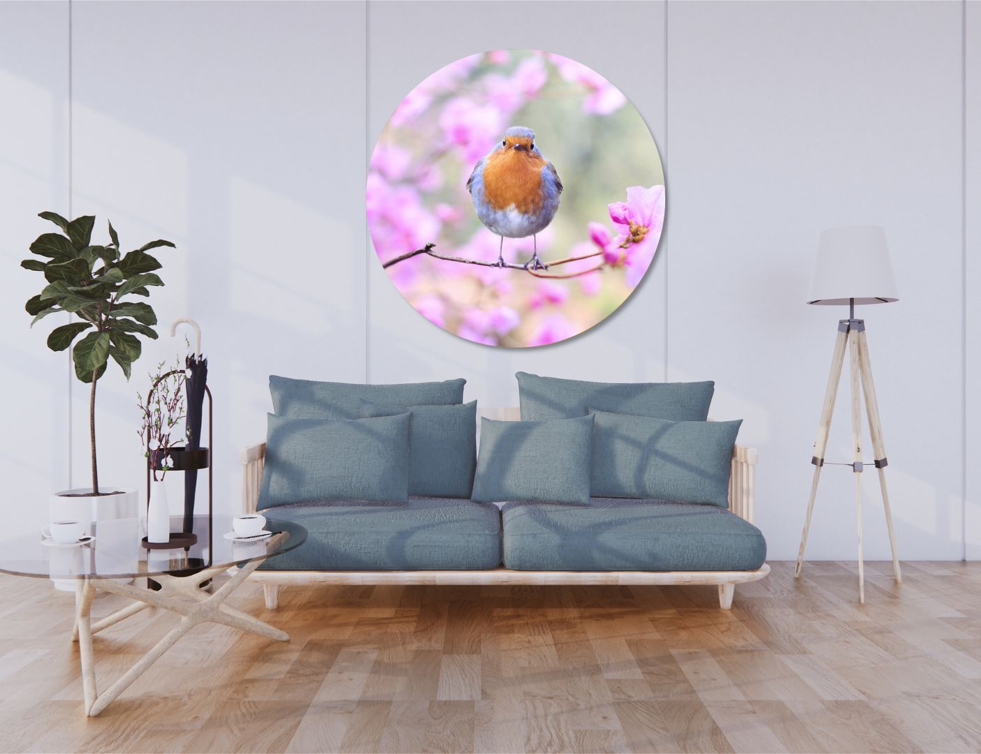 03.07.006 - Roodborstje op tak met roze bloemen - Liggend