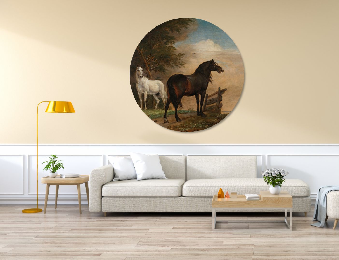 Het schilderij toont twee majestueuze paarden, een bruin en een wit, in een weelderige weide. De dieren zijn het centrale onderwerp van het werk en stralen kracht en elegantie uit. Het hek in de achtergrond geeft diepte aan het schilderij en creëert een gevoel van perspectief. De atmosferische weergave van licht en schaduw draagt bij aan de levendigheid van het tafereel.